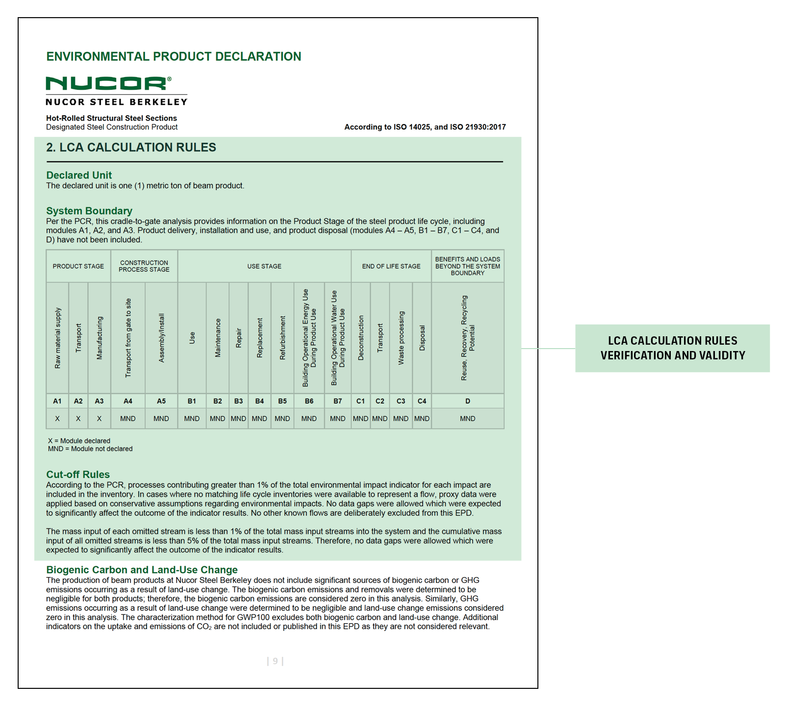 The following key indicators and metrics will be reported within an EPD upon completion of the LCA (the following impact category summary was created in partnership with Nucor and an LCA practitioner):